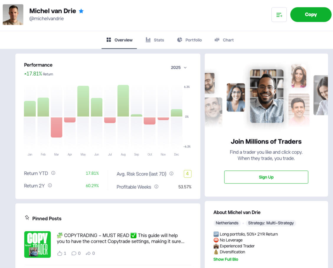 Via eToro kun je mijn portfolio volgen en meekijken hoe ik beleg. Je kunt zelfs geautomatiseerd mijn beleggingen kopieren (copytrading). Dat is voor veel beginners een rustige manier om te starten en te leren tegelijk.